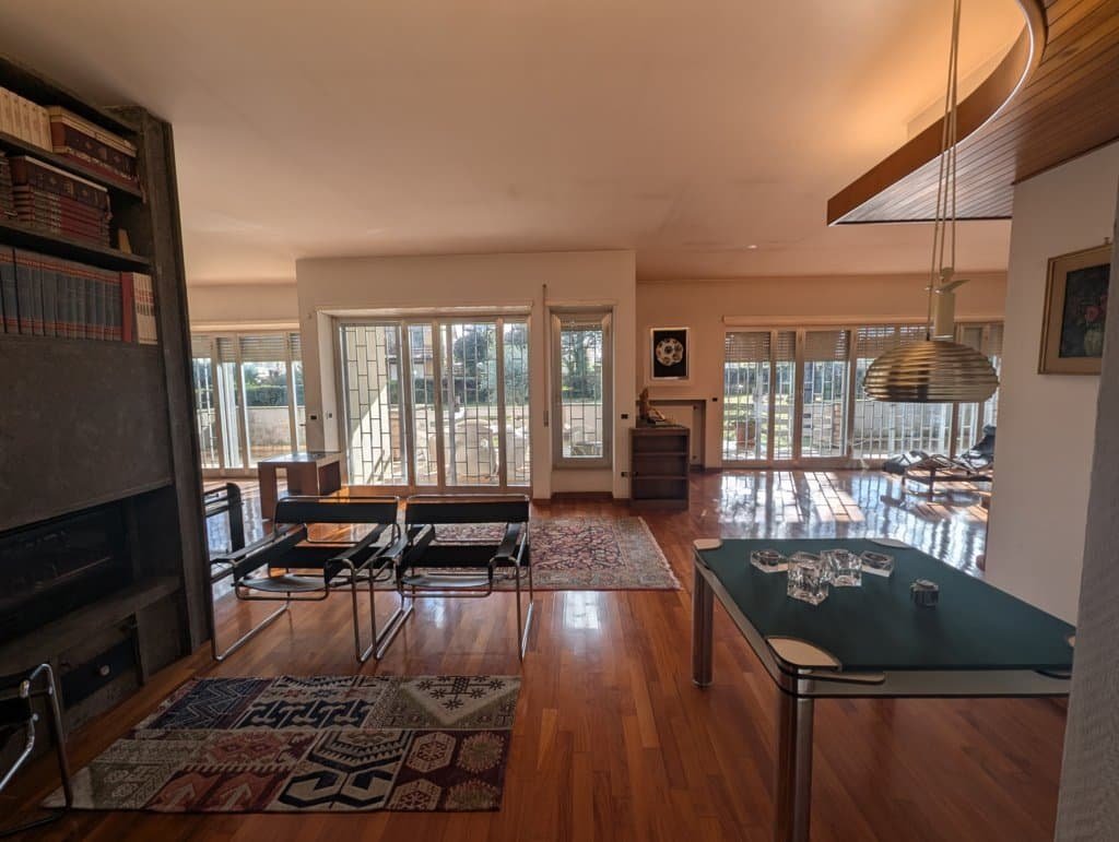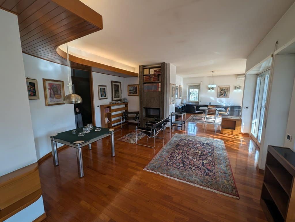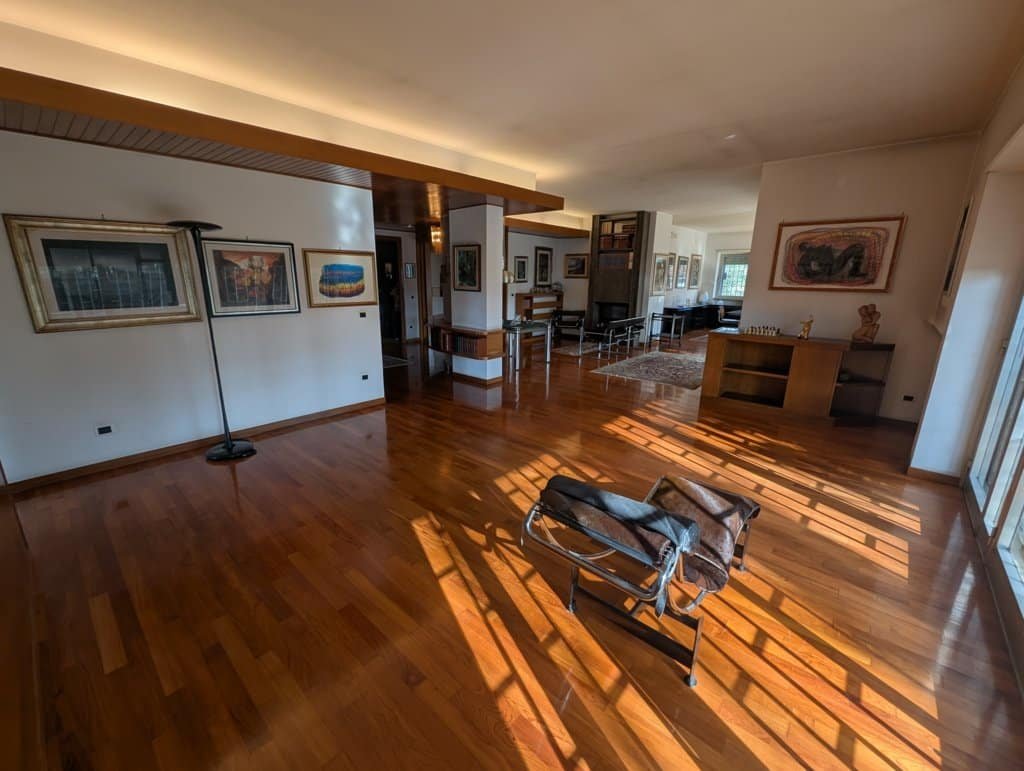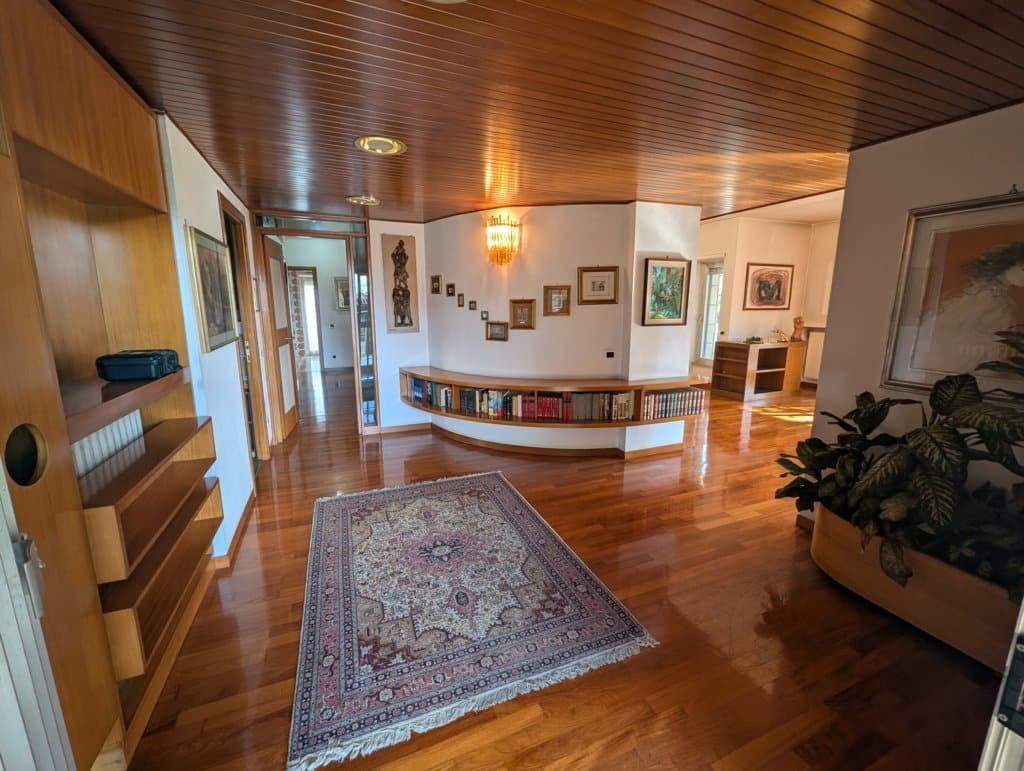 Piano Terra (Zona Giorno e Rappresentanza): Si viene accolti da un ampio ingresso di rappresentanza che conduce allo spettacolare salone triplo di circa 100 mq, articolato in zona conversazione con camino, area relax e sala da pranzo. Il piano comprende inoltre un grande studio, una cucina con dispensa, servizi e una prima camera da letto.
